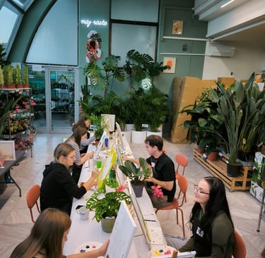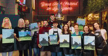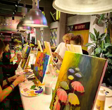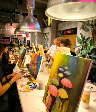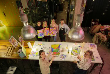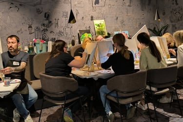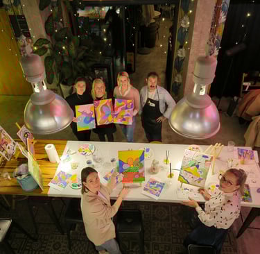 Ker smo pop-up, lahko delavnico izvedemo na lokaciji po vaši izbiri: v pisarni, sejni sobi, restavraciji, na terasi podjetja ali v naravi. Mi poskrbimo za vse – material, stojala, platna, predpasnike, glasbo in tisto posebno atmosfero, ki sprosti in poveže.